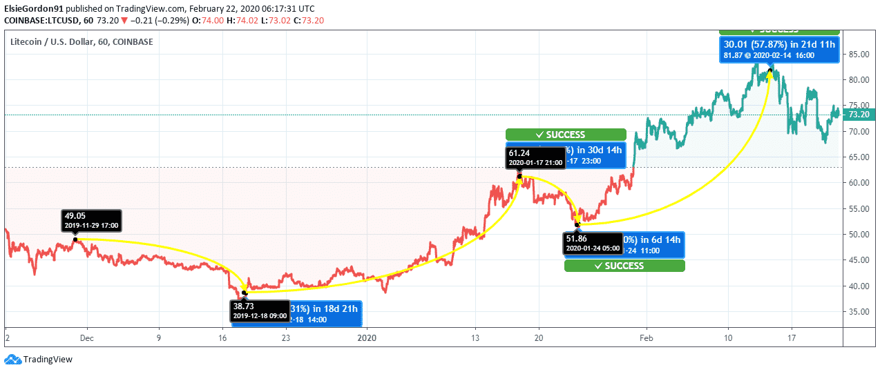 LTC price seems to be in a good phase right now, as seen from the 3-month price trend. The coin was trading at $49.05 on November 29, 2019, and then it slid to $38.73 on December 18, 2019, by 21.31% fall. On January 17, 2020, the price of Litecoin took an upward swing and reached $61.24, showing an upswing of 58.47%. The coin had a minor setback on January 24, 2020, when it fell to $51.86, showing a fall to the extent of 15.10%. From here onwards, the currency started showing upward momentum and reached $81.87 by a massive hike of 57.87%, indicating that the coin is ready to bounce back from bearish pressure. The current day has, however, seen the price of LTC move down slightly to $73.20, the fall being at 10.59%.